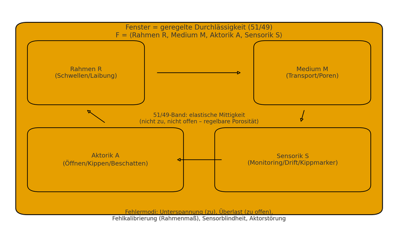 Systemdiagramm – Fenster als RegelkreisRahmen (Schwellen), Medium (Transport/Poren), Aktorik (Öffnen/Kippen/Beschatten) und Sensorik (Monitoring/Kippmarker) bilden einen Kreislauf. In der Mitte liegt das 51/49-Band als elastische Mittigkeit („nicht zu, nicht offen“). Fehlermodi: Unterspannung, Überlast, Fehlkalibrierung, Sensorblindheit, Aktorstörung.Download Systemdiagramm