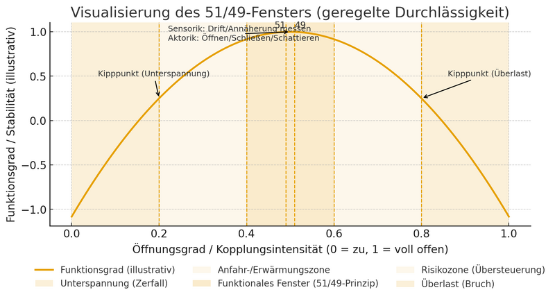 Maßfenster-Gauge – Minimum ↔ 49 | 51 ↔ MaximumEine Skala mit Unterspannungs-Zone, schmalem 51/49-Optimum und Überlast-Zone – als universeller Anker für deine Prüfschemata.Hier ist eine kompakte Visualisierung des „Fensters“ im Sinn deiner 51/49-Logik: X-Achse = Öffnungsgrad/Kopplungsintensität (von „zu“ bis „voll offen“), Y-Achse = Funktionsgrad/Stabilität (illustrativ). Die Schattierungen markieren: