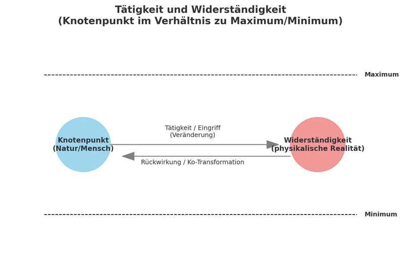 - Zwischen beiden: Tätigkeit = Eingriff, mit Rückwirkung = Ko-Transformation. So wird deutlich: Jede Handlung verändert nicht nur „das Andere“, sondern auch den Knotenpunkt selbst – im Rahmen der dynamischen Grenzen.