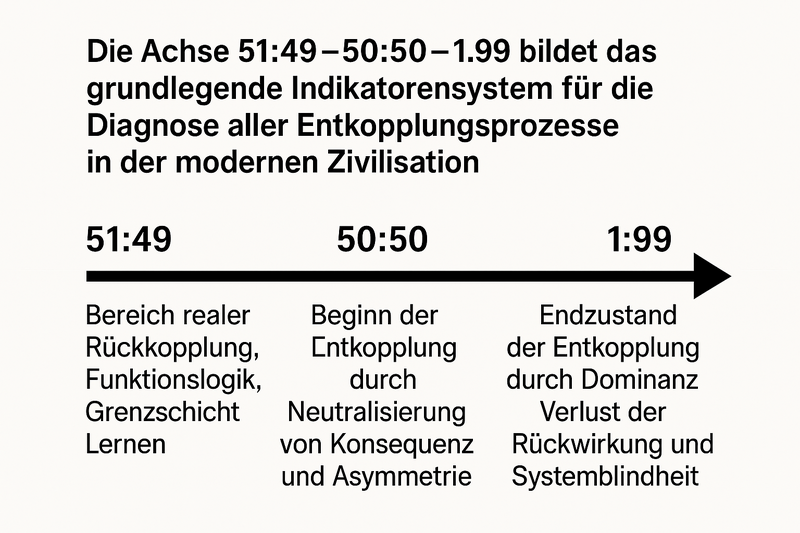 - Zur Identifikation dieser Fehlerstrukturen stelle ich einen Kernmechanismus bereit, der als universelles Raster dient und die Rückkopplungsqualität jedes Wissenssystems analysierbar macht. Seine operative Logik beruht auf der triadischen Struktur Tätigkeit – Widerstand – Rückkopplung. Erkenntnis entsteht dort, wo eine Tätigkeit auf realen Widerstand trifft und daraus eine irreversible Konsequenz hervorbringt. Die minimale Asymmetrie 51:49 stabilisiert diesen Prozess und verhindert Entkopplung. Werden Tätigkeit, Widerstand und Rückkopplung getrennt, entstehen die charakteristischen Fehlbereiche moderner Wissensordnungen.